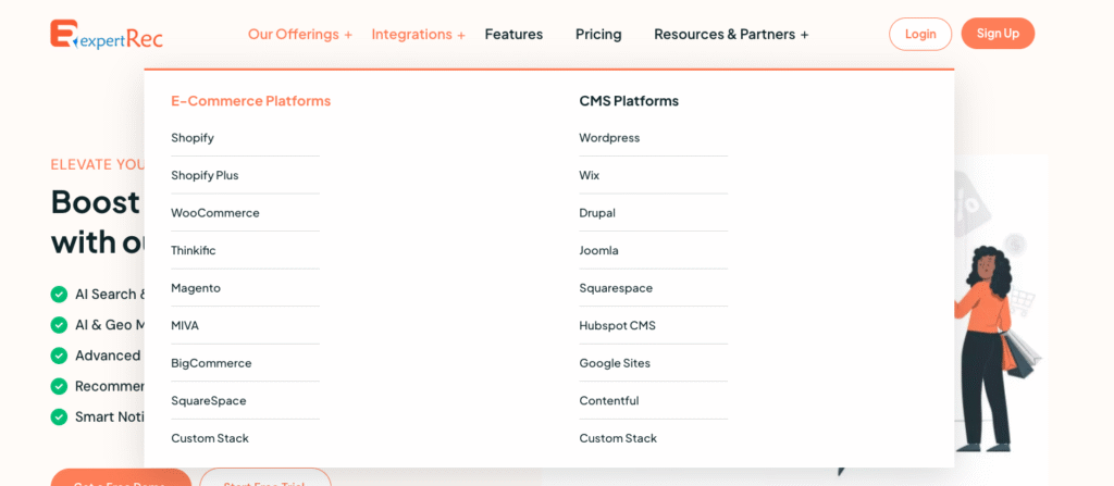 ExpertRec integrates with leading platforms including Shopify, Magento, WooCommerce, BigCommerce, CRMs, HR systems, and intranet portals. By embedding AI search directly into existing tools, it removes silos and streamlines workflows without asking users to adopt new systems.