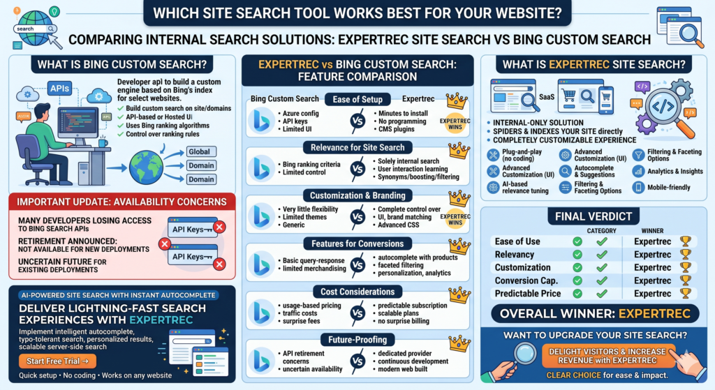 For many years website owners and developers used Microsoft Bing-powered tools to build custom search solutions on their sites. As web development has progressed, so has the need for deeper levels of customization, AI influence in regard to the relevancy of results, and seamless integration into existing business strategies. In this article we will compare Expertrec Site Search vs. Bing Custom Search so that you can determine which solution is the better fit for your site.