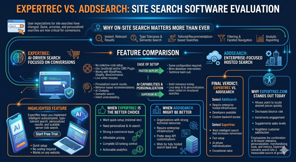 If you are currently comparing site search engines or if you are seeking a high-performance alternative to AddSearch, please review this detailed comparison of the two products, focusing specifically on how Expertrec.com delivers a superior, conversion-focused site search experience.