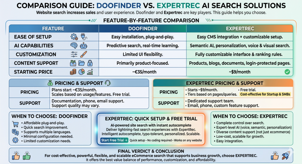 In this article, we will provide a complete comparison of Expertrec and Doofinder, and provide numerous reasons as to why Expertrec is quickly becoming the top choice for businesses looking for a flexible and cost effective search tool alternative
