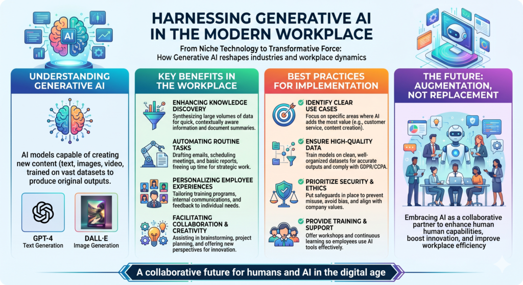 Generative AI is a game-changer for the workplace, offering the potential to automate routine tasks, enhance creativity, improve collaboration, and personalize the employee experience. By implementing generative AI thoughtfully, businesses can unlock new opportunities for productivity and innovation, setting themselves up for success in the digital age.