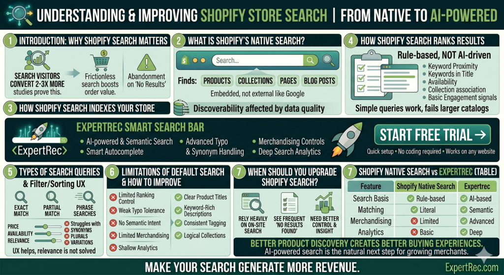 Shopify native search works for basic needs, but as catalogs grow, limitations appear.