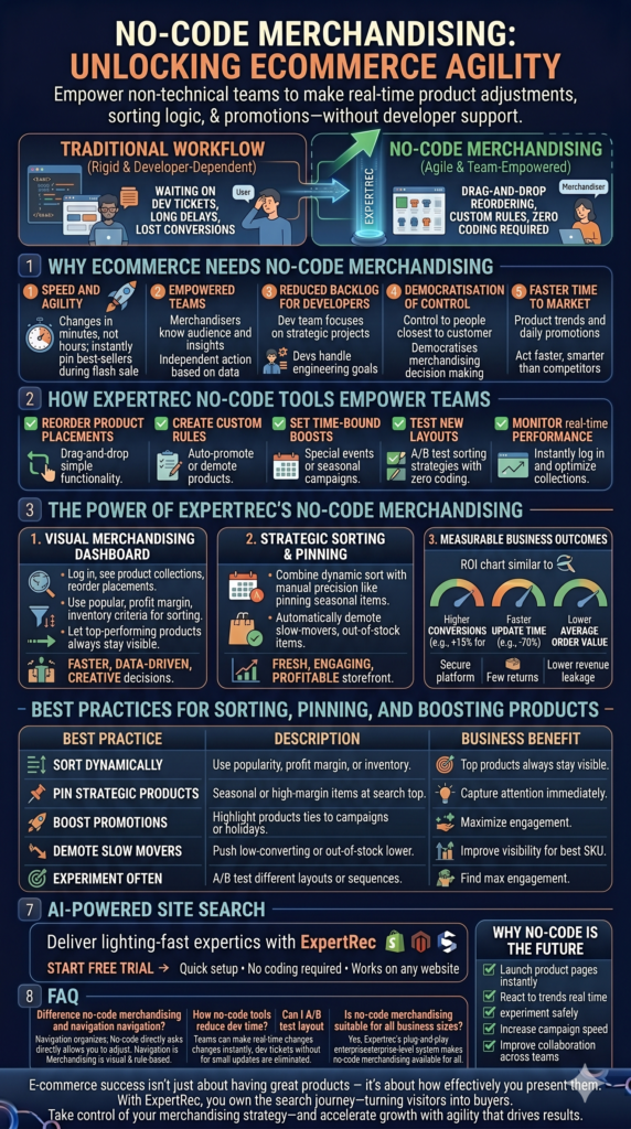 No-code merchandising allows non-technical teams to make real-time adjustments to how products appear, sort, and perform on the website—without involving developers.