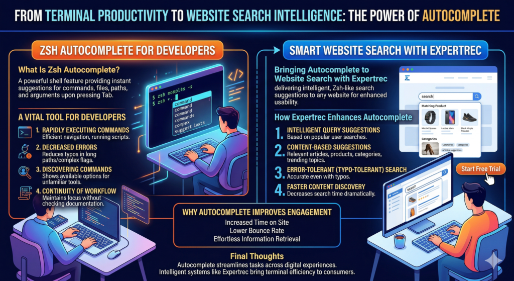 In this article, we will analyze what Zsh autocompletion is and how it positively affects the developer experience, as well as how intelligent suggestions are being used on websites through solutions such as Expertrec.